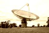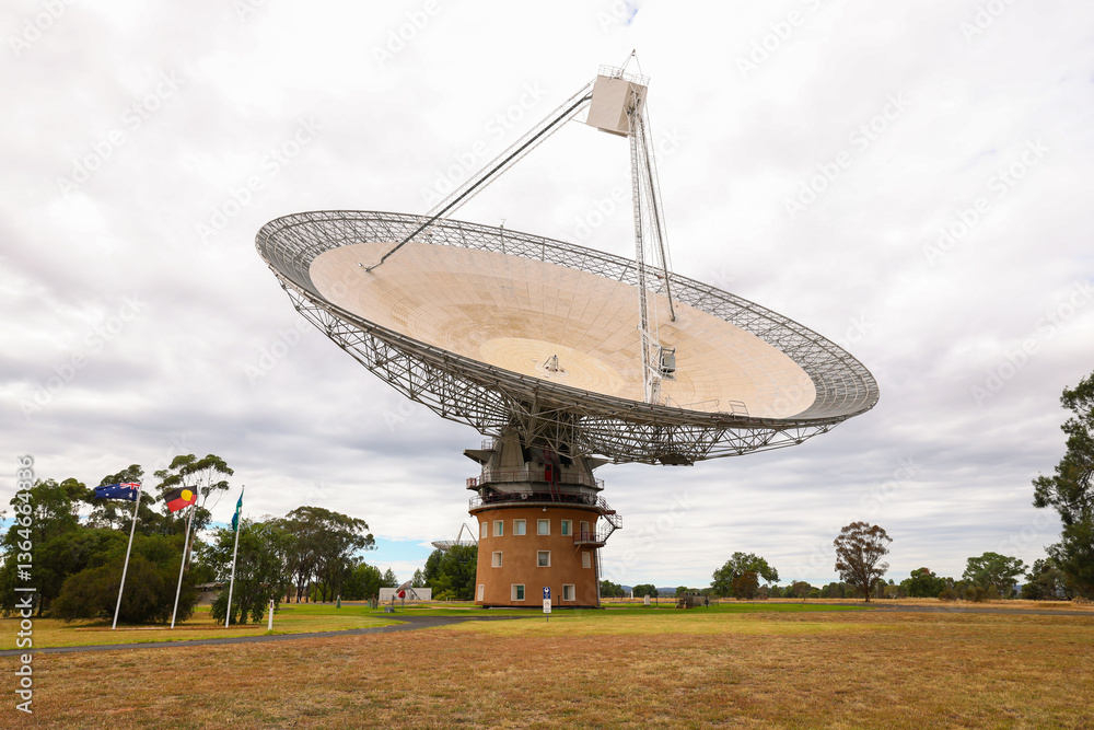 The Parkes Radio Telescope, known as "The Dish," stands beneath a moody, overcast sky in Parkes, New South Wales, Australia.