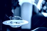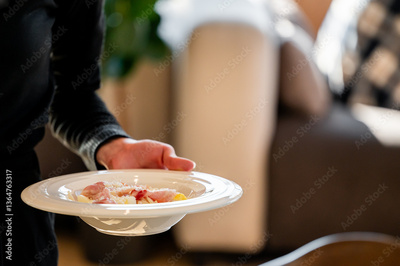 Close-up of a hand holding a white plate with pasta, ham slices, and grated cheese, on a blurred indoor background, ideal for food or dining concepts.