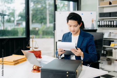 Attractive young lawyer in office Business man and lawyers discussing contract papers laptop