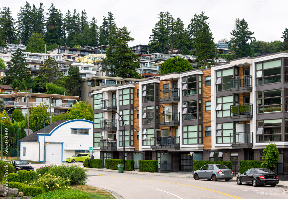 A perfect neighborhood. Uphill residential area with cars parked on the streets around the building