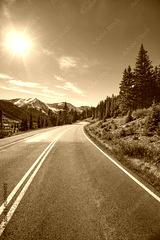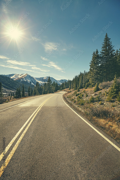 Scenic mountain road against the sun, retro color toned picture, Colorado, USA.