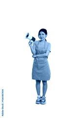 Beautiful Asian woman holding smartphone and smiling on white background.