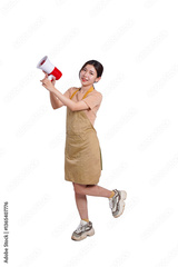 Beautiful Asian woman holding smartphone and smiling on white background.