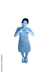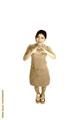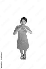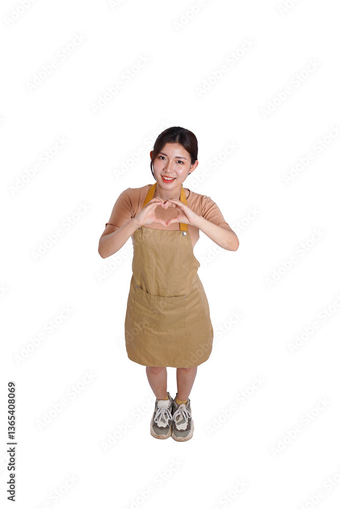 Beautiful Asian woman holding smartphone and smiling on white background.