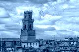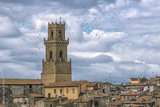 A flock of birds flies over the historic center of the tuff village Pitigliano, Grosseto, Tuscany, Italy