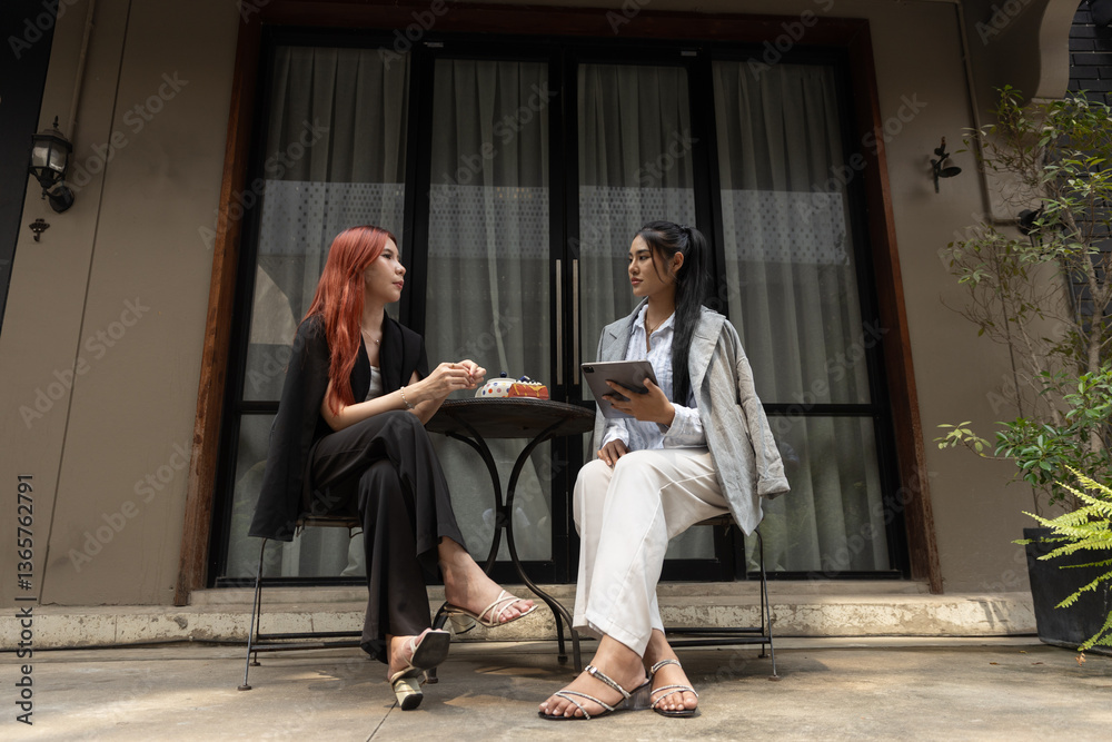 Two women sitting using tablet presenting work and discussing ideas outdoor environment during afternoon. Their engaged expressions suggest meaningful dialogue. female colleague brainstorming working.