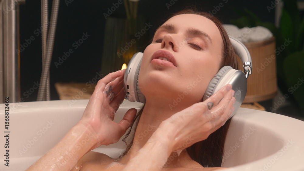 Relaxed resting calm tranquil Caucasian woman in bath relaxing in warm bathtub listening music headphones wireless earphones podcast audio song girl female in bathroom beauty routine spa meditation