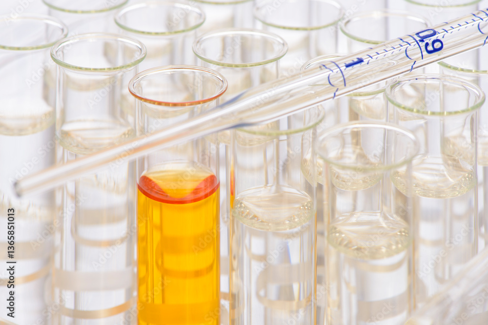 In einem Labor stehen viele Reagenzgläser mit einer gelben Flüssigkeit