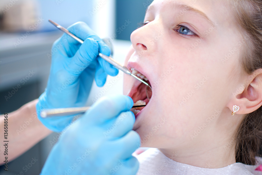 Close up of young girl with open mouth having her teeth examined by dentist.