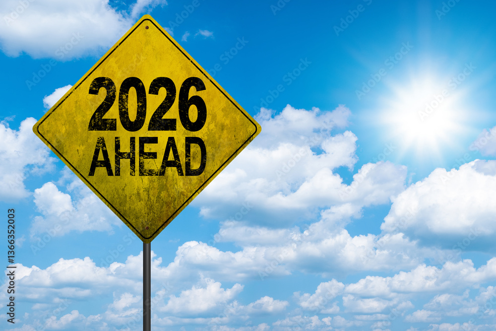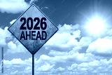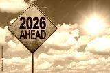 2026 Metal signpost with yellow dirty road sign. Image of a signpost pointing in the direction of the year 2026