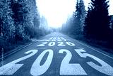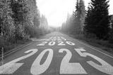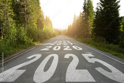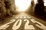 New year 2026 or straight forward concept. Text 2025, 2026, 2027, 2028 written on the road in the middle of asphalt road with at sunset. Concept of planning, goal, challenge, new year resolution.