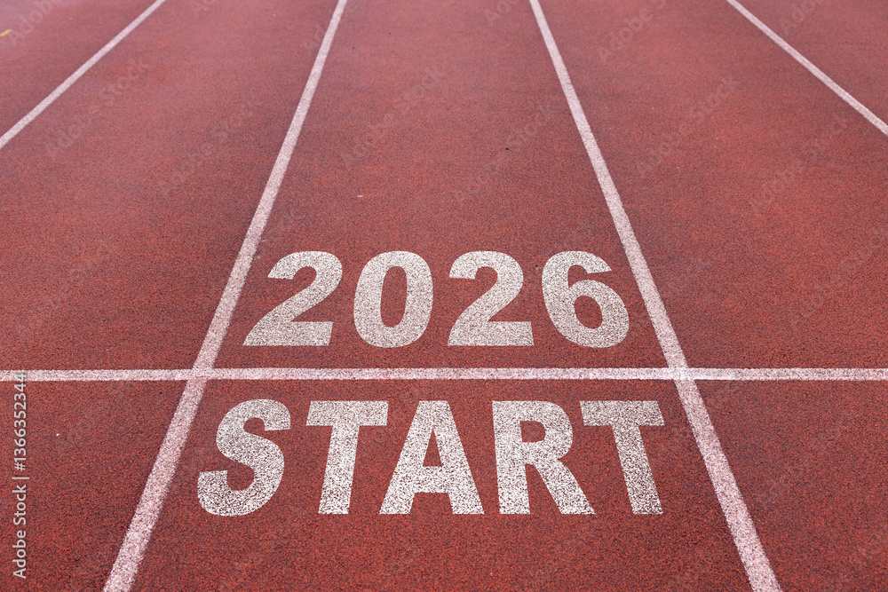 New year 2026 written on the road in the middle of athletics track as a start. Concept of planning