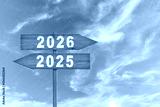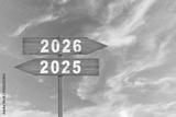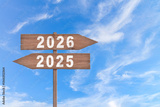 Text 2026 and 2025 written on the wood arrow with sky background. Concept of planning, goal, challenge, new year resolution.
