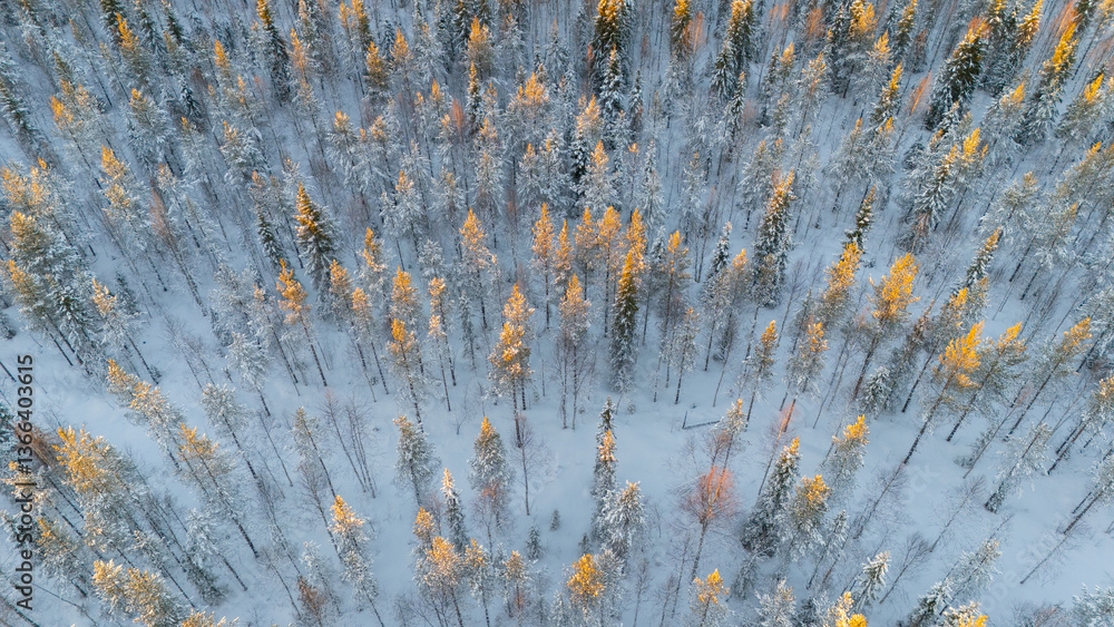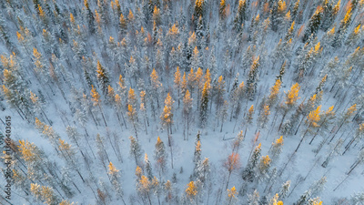 Frosty evening in Lapland in winter. Drone landscape. Levi Finland.