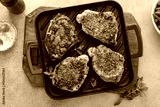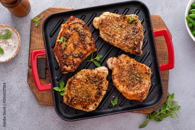 Pork chops with herbs and garlic grilled or sauteed on a pan