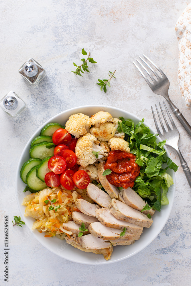 Healthy lunch bowl with grilled chicken, roasted cauliflower and fresh vegetables