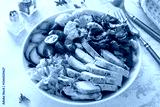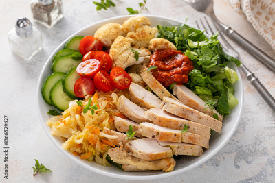 Healthy lunch bowl with grilled chicken, roasted cauliflower and fresh vegetables