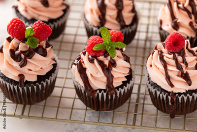 Raspberry chocolate cupcakes with raspberry buttercream frosting a drizzle of chocolate glaze