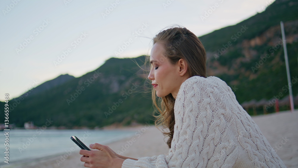 Vacation woman using smartphone for online communication at ocean shore closeup.