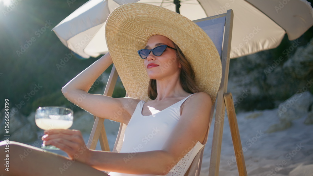 Girl sipping cocktail tropical beach sitting lounger under umbrella closeup