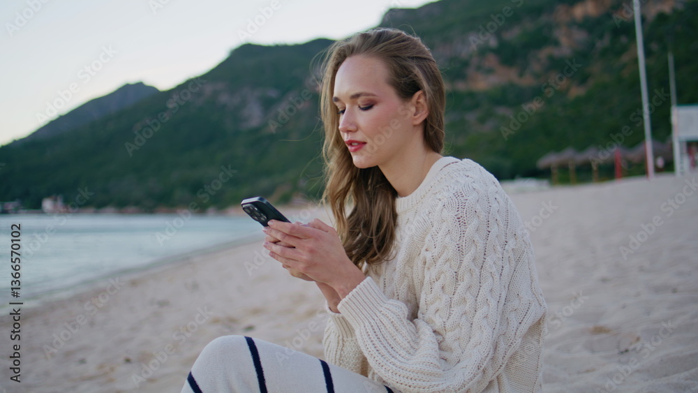 Woman looking smartphone sea shore calm evening closeup. Romantic girl reading