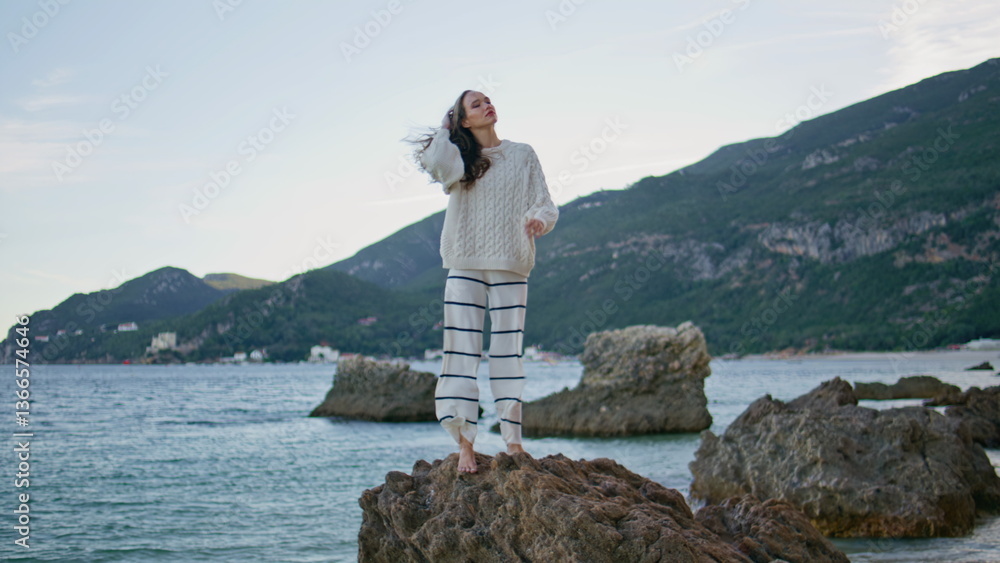 Woman enjoy windy sea morning standing coastal rocks. Relaxed lady raising hands