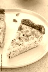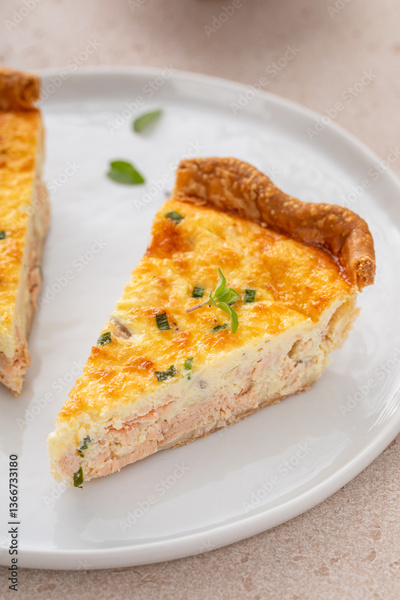 Salmon quiche freshly baked on a serving board, healthy breakfast idea