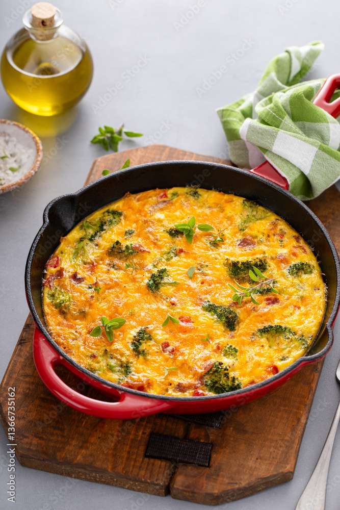Broccoli, bacon and cheese frittata in a cast iron pan, healthy breakfast idea