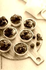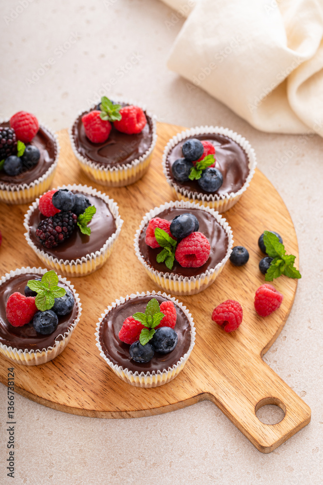 Mini cheesecakes baked in a muffin pan topped with chocolate ganache and fresh berries