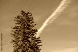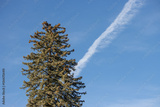 pine tree branches against blue sky with a contrail