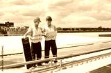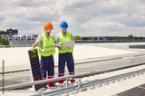 Technicians on the roof, using a laptop to install or maintain solar panels. This work ensures the efficient operation of the photovoltaic system, harnessing solar power for energy production.