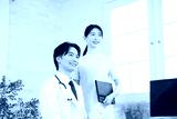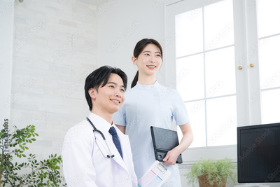 ドクターと看護師のクリニックで見上げる未来や目標を見つめるイメージ