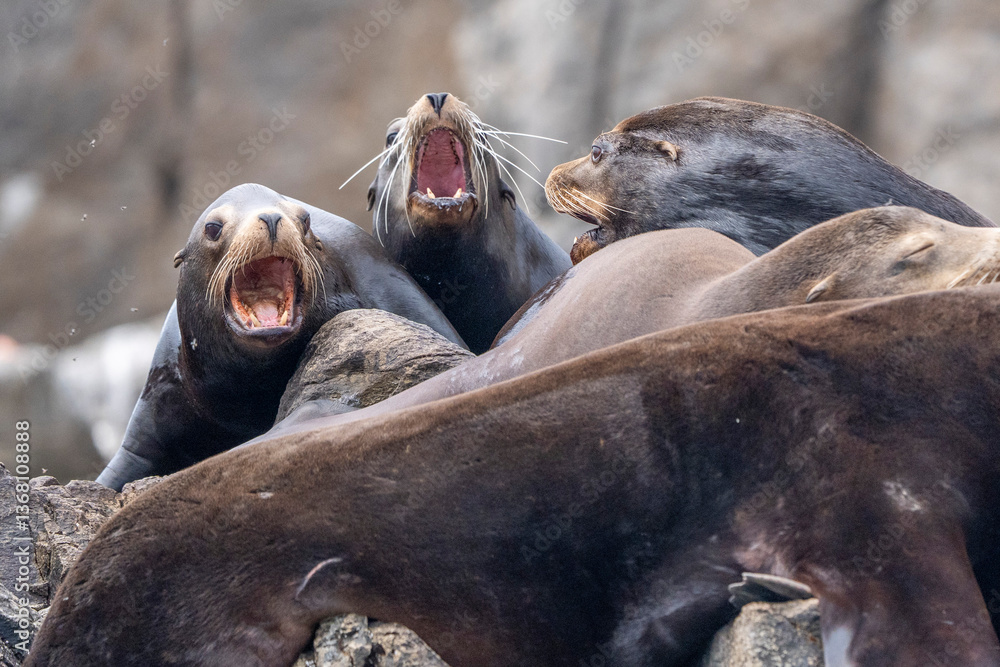 Sea Lion colony yelling in Cortez Sea Isla Cerralvo baja california sur mexico relaxing on the rocks