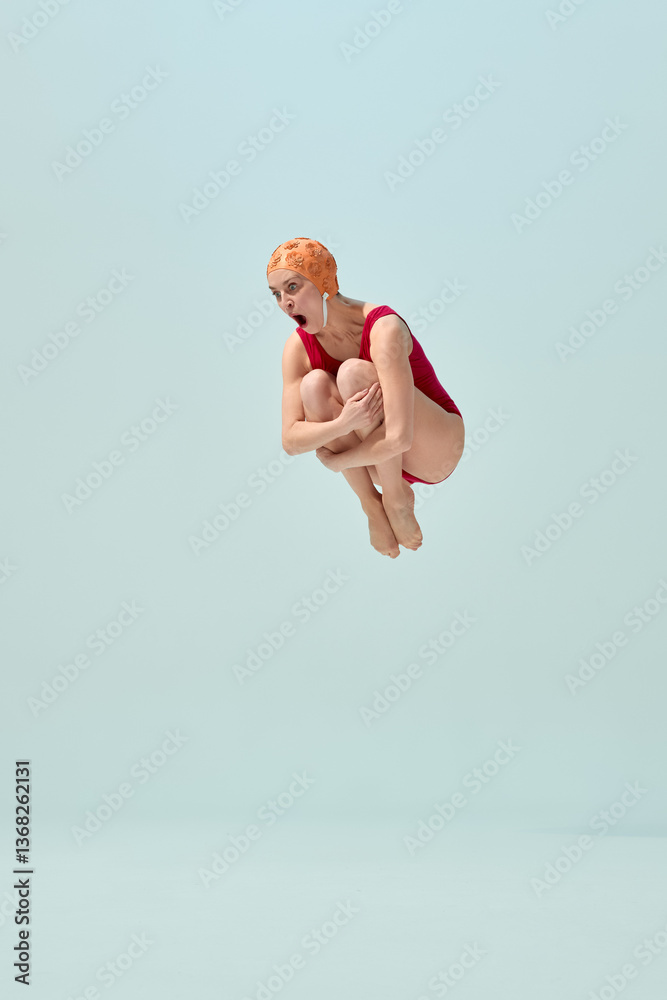 Diver in red vintage swimsuit and orange cap making cannonball pose in air with comic expression. Concept of summer fun, playful holiday, vintage swimsuit style, humor, retro sport.