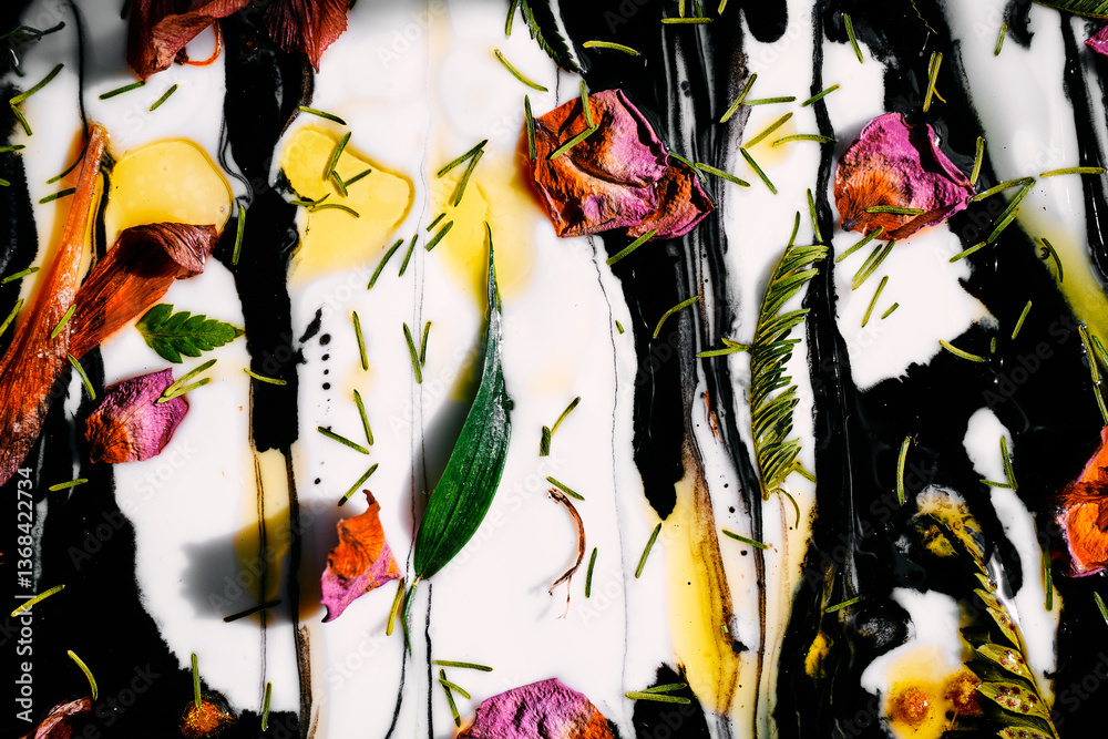 Colorful botanical chaos with petals, herbs and oil on black and white striped liquid background. Organic abstract texture