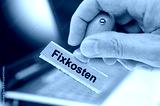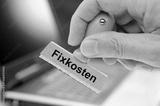 Ein Holzstempel in der Hand ist beschriftet mit Fixkosten
