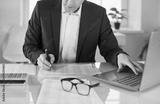 Young business man accountant in suit working at desk with financial documents on his workplace in office. Company employee sitting at table with laptop making company audit. Accounting job concept.
