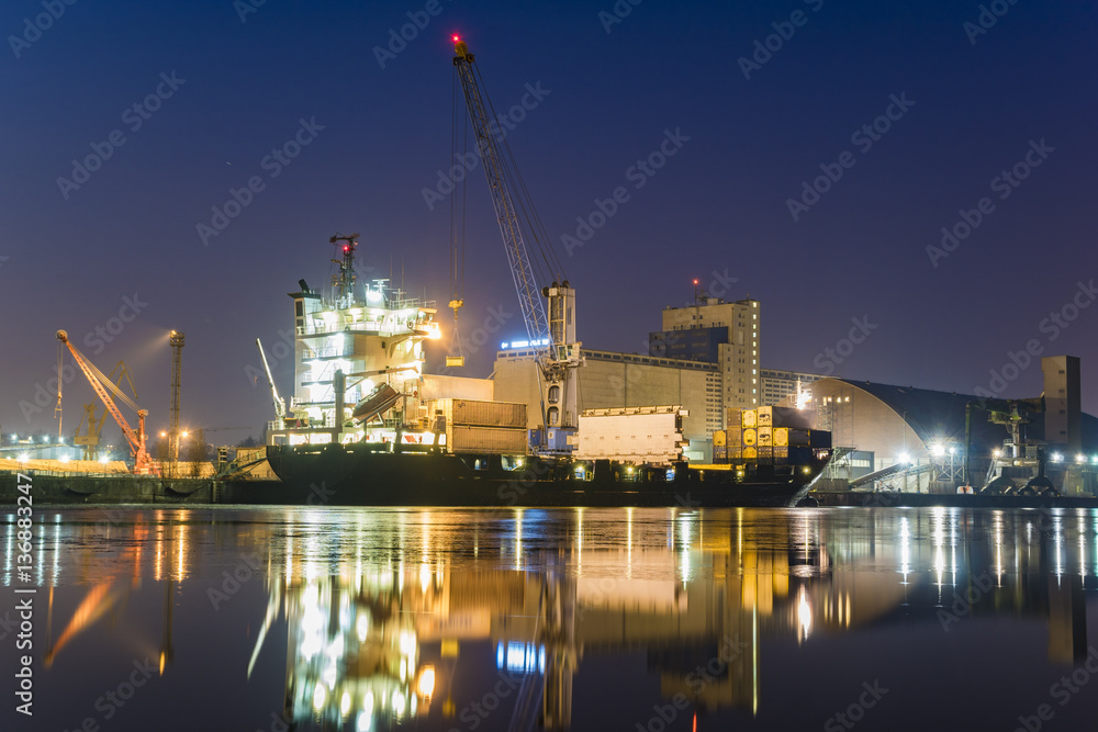 unloading cargo ship with containers in sea port at night