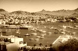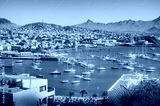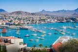Aerial view of vibrant and colorful day over Mindelo city, and its cove full of ships at docks, Sao Vicente island, Cape Verde