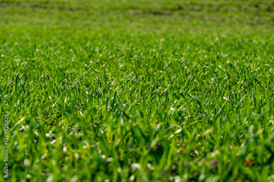 Bright green grass fills the landscape under clear blue skies, showcasing the beauty of nature in a sunny environment