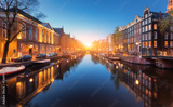 Colorful cityscape at sunset in Amsterdam, Netherlands. Reflected city lights in water with blue sky at twilight. Night illumination of buildings and boats on the water. Travel. Beautiful street