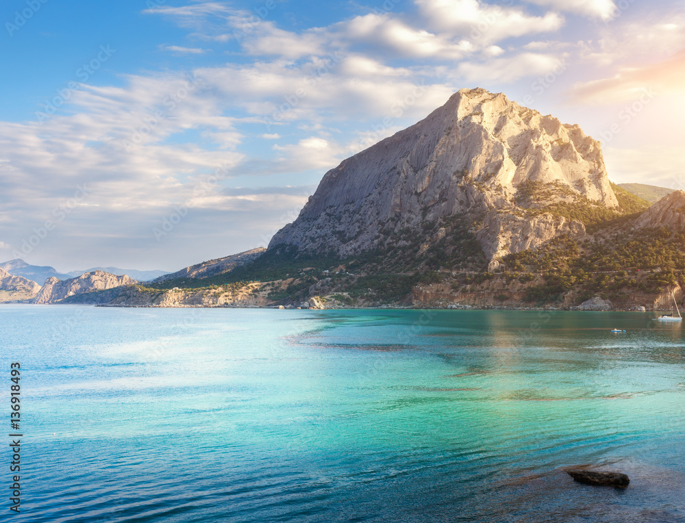 Summer seascape at sunset. Beautiful sea against mountains and blue sky with clouds and sunlight. Travel and nature background. Colorful landscape. Turquoise sea. Vacations in Crimea