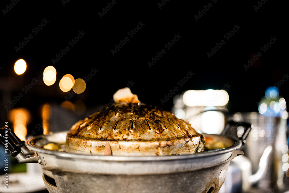 Dirty iron pan for barbeque burn skillet and without soup after eating Moo krata at night
