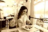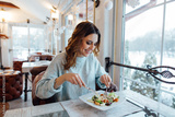 Smiling woman eating fresh salad in restaurant