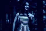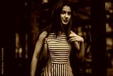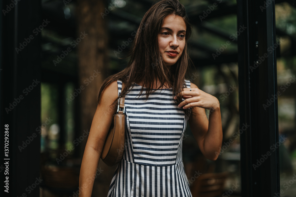 A young woman in a striped dress confidently walks through a modern outdoor area, exuding elegance and style. Her relaxed demeanor suggests a sense of freedom and confidence.