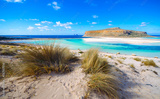 Amazing panorama of Balos Lagoon with magical turquoise waters, lagoons, tropical beaches of pure white sand and Gramvousa island on Crete, Greece