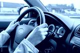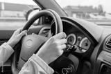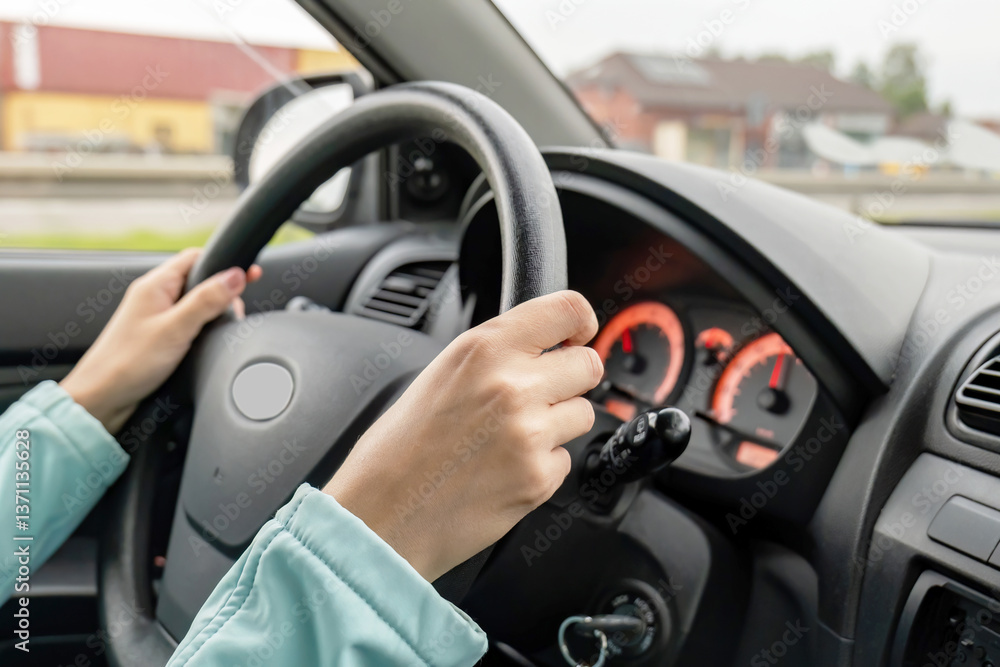 Closeup of woman’s hands on a steering wheel while driving her car through the city streets vehicle interior with dashboard anonymous female vehicle driver concept personal transport travel lifestyle
