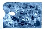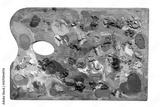 Old wooden artist palette with dried colorful oil paints isolated on white background cut out top view of traditional painting tool, textured pigment color mixes, creative art tools concept, nobody