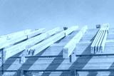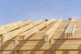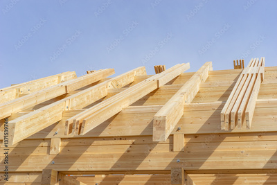 Roof of wooden house under construction. Rooftop buildings made of beams. Sloping roof under construction under blue sky. Erection roofing made of lumber. Unfinished pitched roof of wooden building