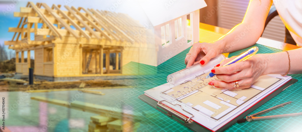 Architectural design. Hands of engineer with room-by-room drawings of house. Wooden frame building under construction. Clipboard with architectural drawings. Drawing up room plan before construction